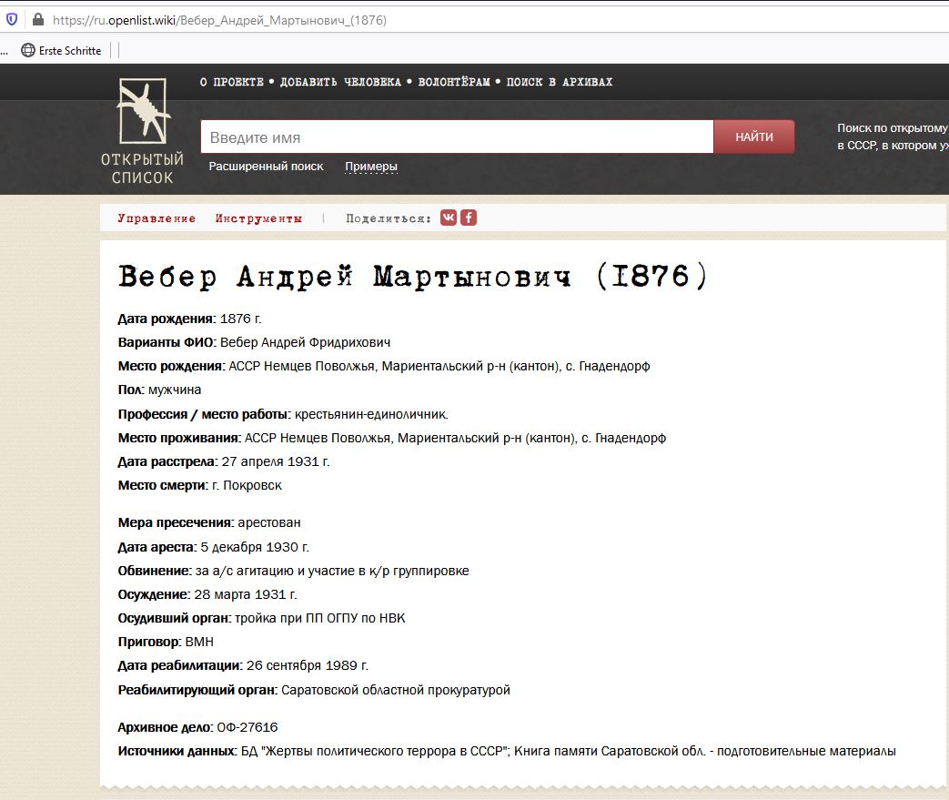 In den Listen der unterdrückten Deutschen der Wolgaregion fand ich einen Eintrag über die Verhaftung und Hinrichtung von Andrei Martynovich (Heinrich Martinovich) durch die Bolschewiken im Jahr 1931 (den Originaleintrag siehe hier). Amalia Gotlibovna wurde 1932 geboren und besuchte ihren Großvater als Kind im Exil (1936-1937). Ihr Großvater wurde 1931 nicht erschossen. Ich beschloss, die Listen aller unterdrückten "Andrei Weber" weiter zu prüfen und fand eine Personenkarte mit einem Foto von Andrei Khristianovich Weber. Laut der Personenkarte war Andrei Khristianovich Weber (geboren 1887 in Gnadendorf) ein Kulak, lebte im Bronnitsky Bezirk des Moskauer Gebiets und arbeitete in der Plemsovkhoz "Nikonovskoye" als Viehzüchter. Am 1. Juni 1938 wurde er von einer Kommission des NKWD der UdSSR beschuldigt, eine konterrevolutionäre Gruppe von Deutschen anzuführen, und zur Todesstrafe verurteilt. Zwei Wochen später wurde das Urteil vollstreckt (siehe die Original-Personalkarte hier).