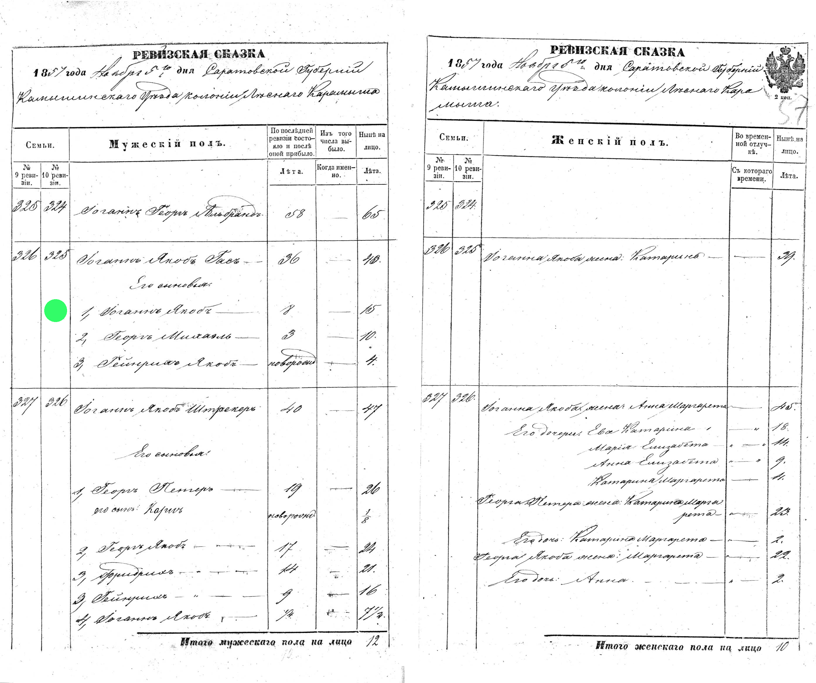 Nun, "unser" direkter Vorfahre - Johan Jacob Haas (mittlerer Sohn) verließ im Alter von 19 Jahren sein Elternhaus und zog 1833 in die benachbarte Kolonie Grimm (siehe Zählung von 1834), wo er 1841 heiratete. Johan Jacob und seine Frau Katharina hatten drei Söhne, Johan Jacob junior (1842), Michael (1847) und Heinrich Jacob (1853), der der Großvater mütterlicherseits von Christina Yakovlevna Dumler war (siehe Zählung von 1857).