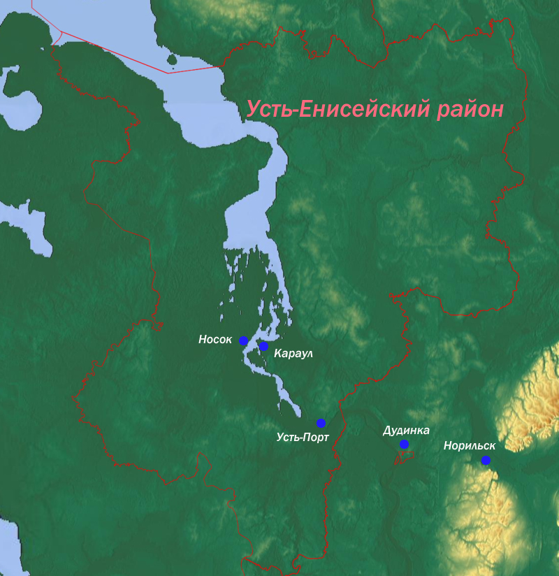 Im Jahr 1930 wurde Karaul zum Verwaltungszentrum des Bezirks Ust-Jenissei. Trotz seiner enormen Größe (er reichte bis zur Küste des Arktischen Ozeans) umfasste der Bezirk nur 10 Siedlungen - Dixon, Nosok, Tolstoi Nos, Leskino-Kosovo, Munguy, Galchikha, Innokentyevsk, Karaul und Ust-Port. Die Gesamtbevölkerung dieser Siedlungen belief sich auf etwa 2.400 Menschen. Darüber hinaus lebten auf dem Gebiet des Bezirks etwa 1 900 Nomadenvölker. Eine Karte des Bezirks Ust-Jenissei sowie der Siedlungen Karaul und Dudinka finden Sie hier.